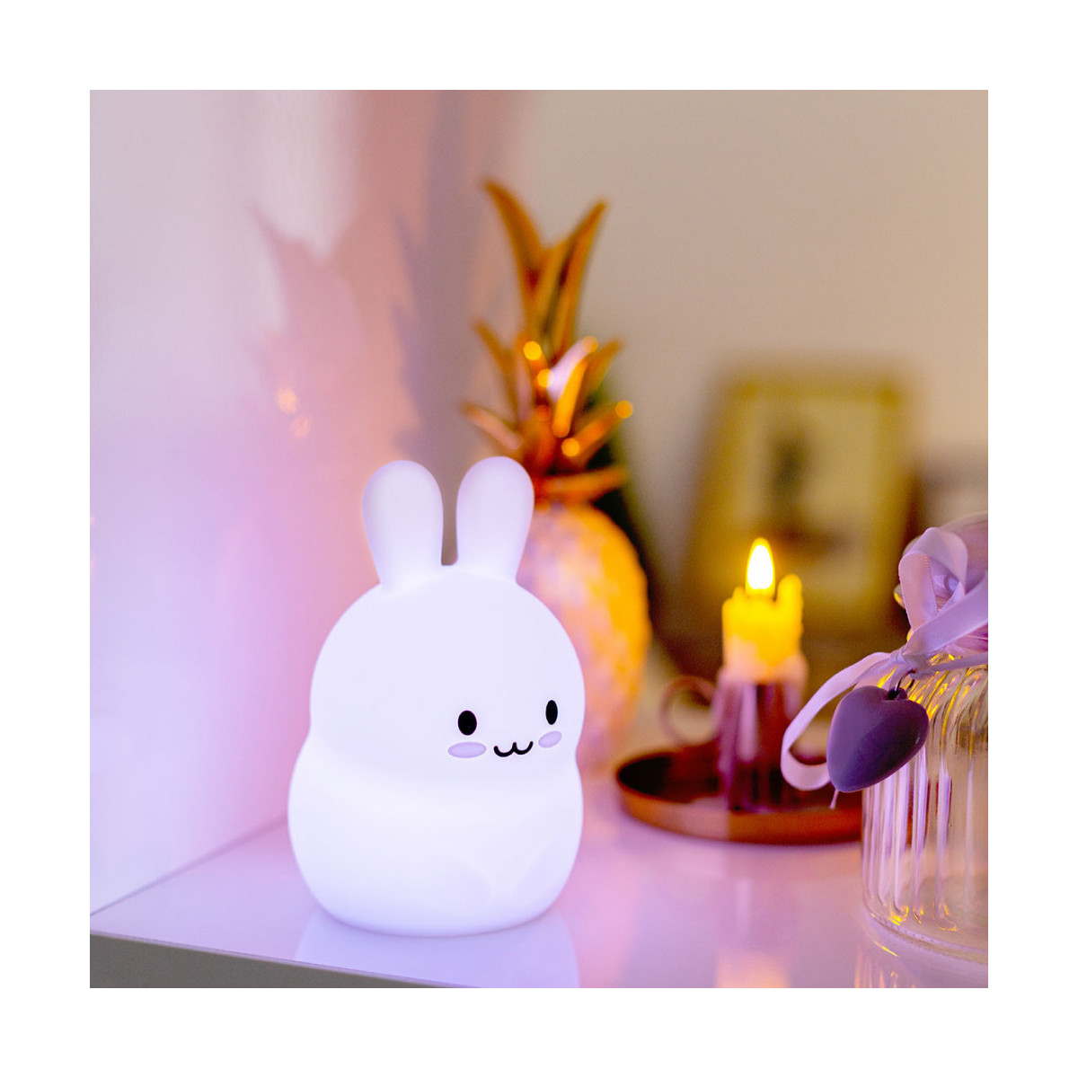 Das Kaninchen wacht! Sein Licht beruhigt die Kleinen und verjagt nächtliche Angst. Berühren Sie die Nachtlampe, um ein gleichmäßiges weißes Licht oder eine Animation von 9 verschiedenen Farben zu erhalten.
