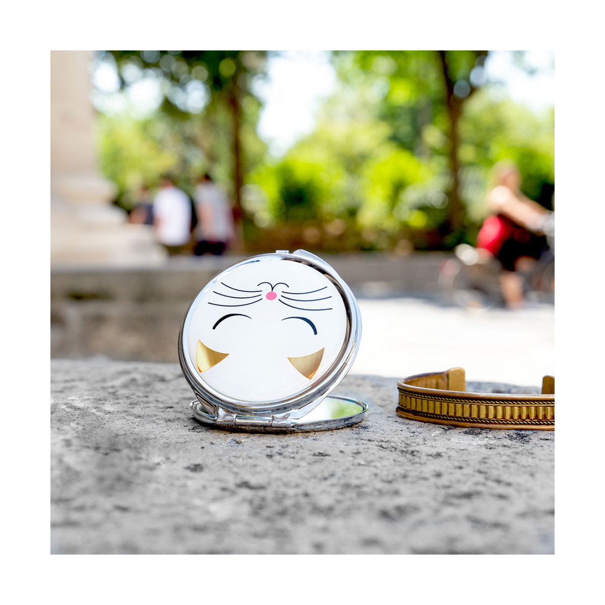 Petit miroir de poche très pratique pour mettre dans le sac à main. En 2 parties une classique et une grossissante. Très solide. Je l’ai dans la collection palette. Je l’adore ☺️