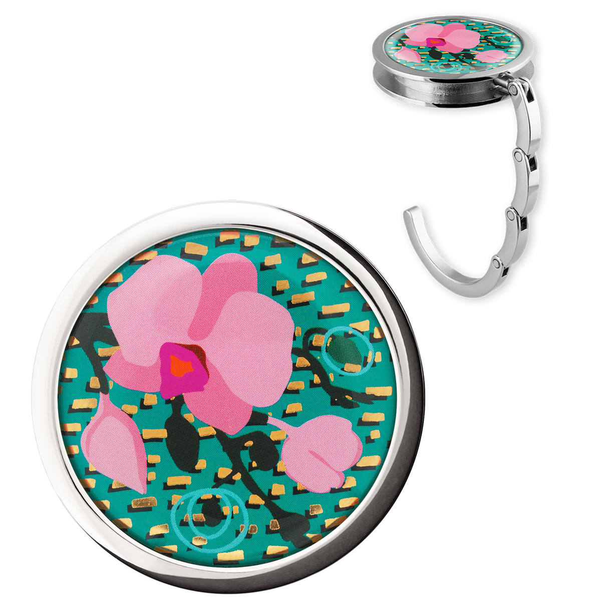 Pull out my arm and place me on a flat surface. Now you’re hooked! A portable bag holder! Use it to hang handbags in restaurants, laptop cases at the office and coats on a shelf. Shine while you dine!