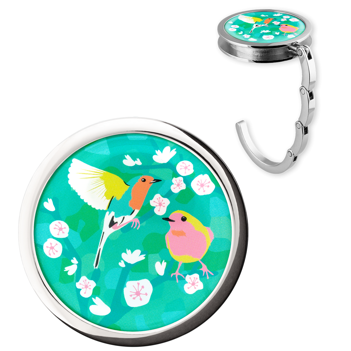 Pull out my arm and place me on a flat surface. Now you’re hooked! A portable bag holder! Use it to hang handbags in restaurants, laptop cases at the office and coats on a shelf. Shine while you dine!