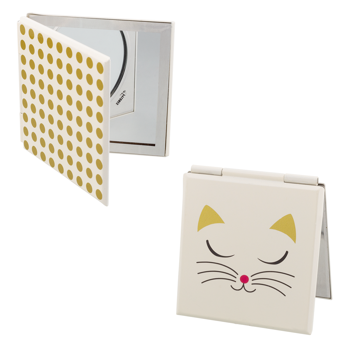 I’m a tiny two-sided pocket mirror (magnifying mirror on one side). Small but perfectly formed, I'm the opposite of a looking glass!