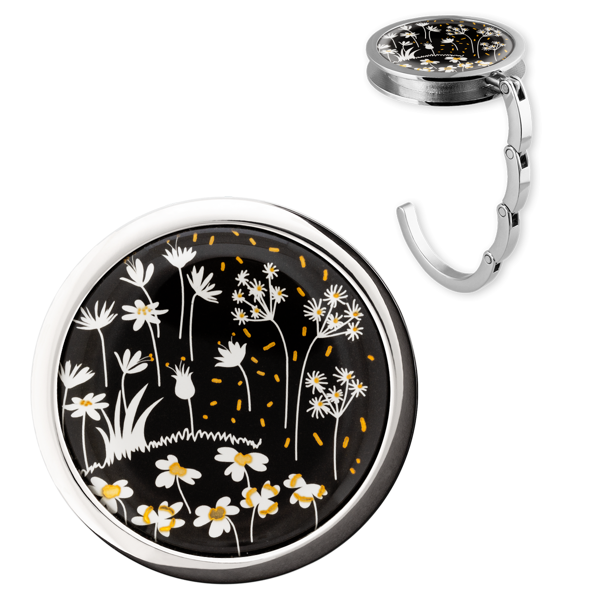 Dépliez mon crochet, posez-moi sur une surface plate. Hop! Un crochet de suspension mobile! Parfait pour accrocher votre sac à main ou votre masque à la table d'un resto, sacoche d'ordinateur à un bureau, manteau à une étagère. Vos effets garderont leur lustre.