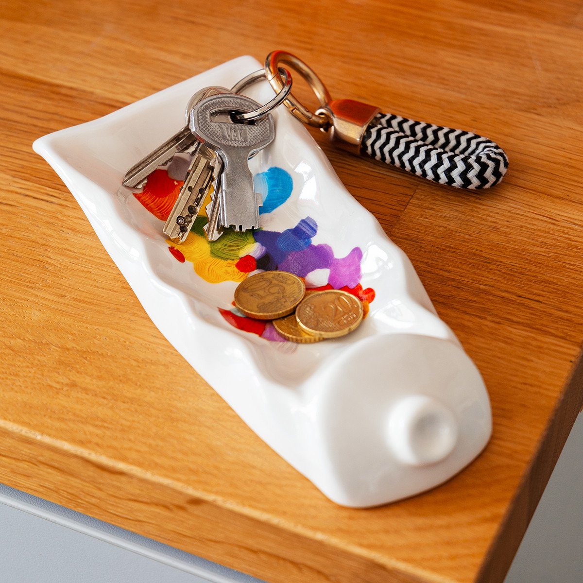 Drop Art est l’art de contenir tout ce qui vous plaira ! Ramasse-monnaie ou vide-poche, il gardera avec style vos affaires. N’hésitez pas à l’utiliser dans votre salle de bains pour poser votre brosse à dents ou votre savon ! Multiusage, il apportera un air artistique à votre bureau en sublimant vos accessoires de travail.