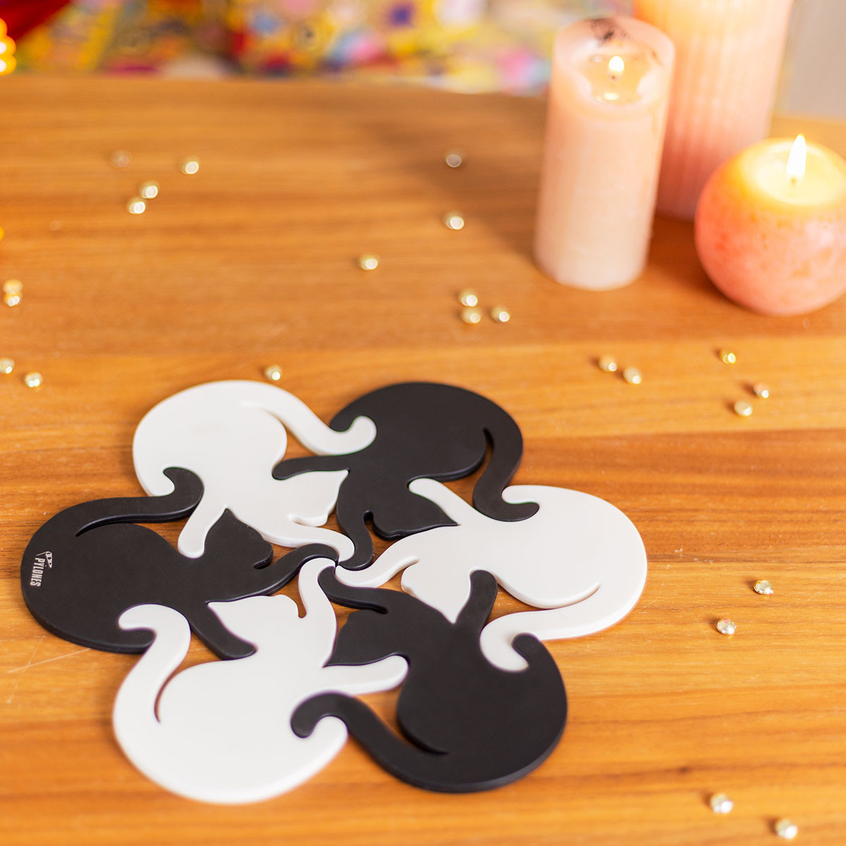 Ces chats ne sont pas farouches et seront patte dans la patte. Entremêlez, ils résisteront à la chaleur de votre casserole. Séparez, ils accueilleront et sublimeront votre verre.