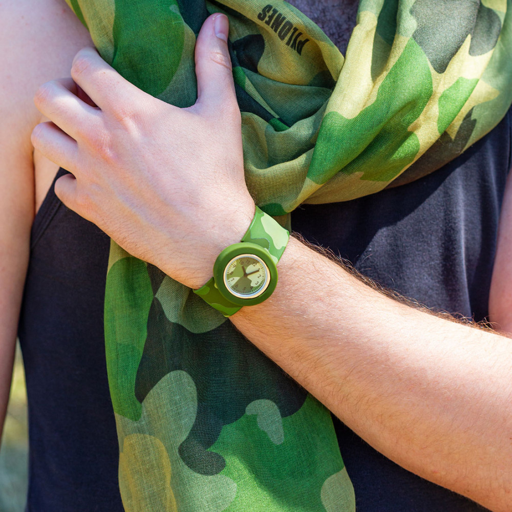 Toujours à l'heure, même en mode camouflage ! Pas de temps à perdre : elle s'enroule automatiquement autour de votre poignet en quelques secondes avec une simple pression