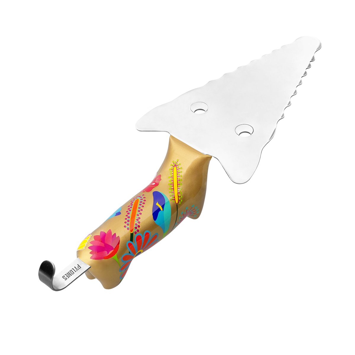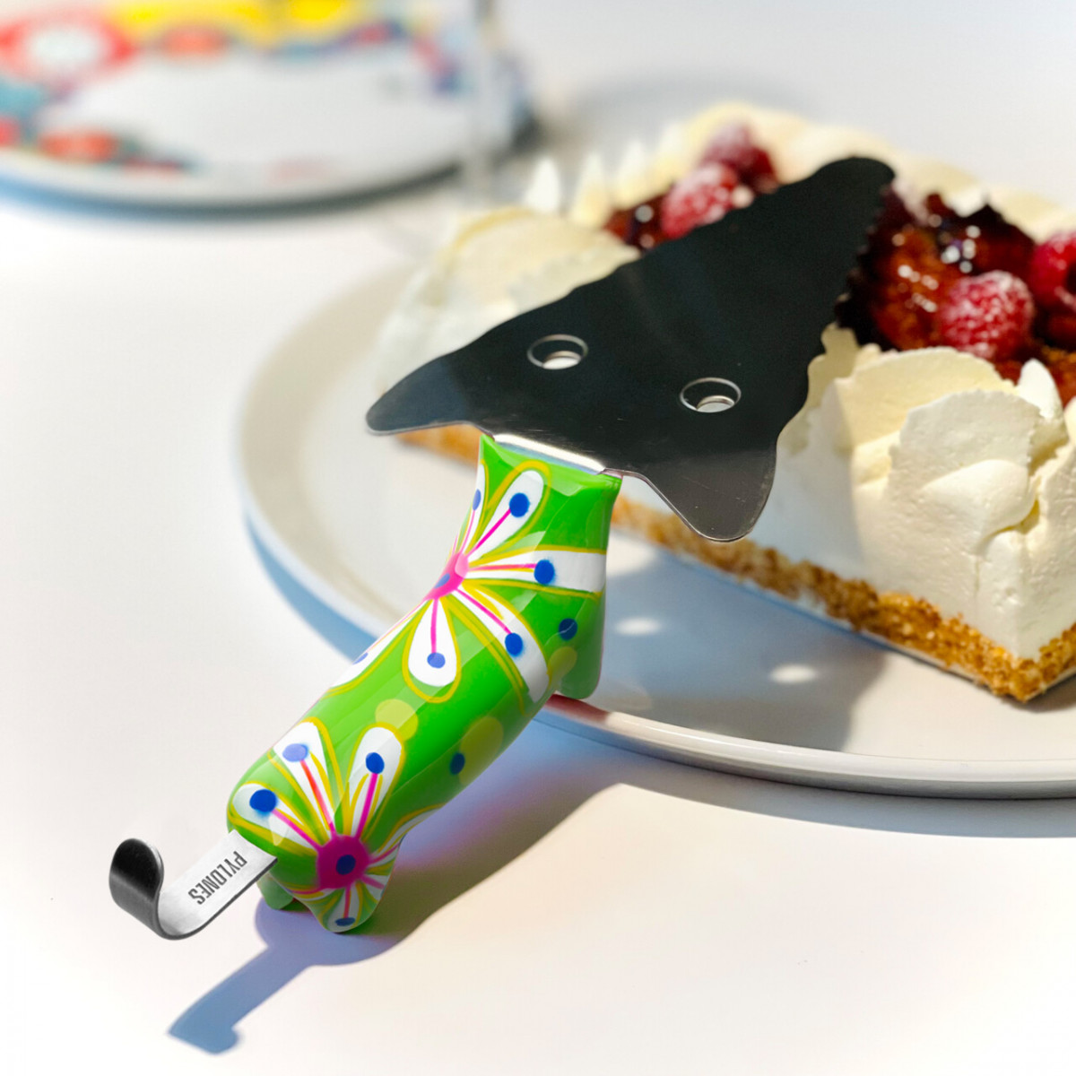 Je suis une pelle à tarte mais j'aime également les gâteaux, les quiches, les pizzas et tout ce qui est fait de pâte. Avec mes petites dents je découpe à la perfection vos parts de gâteau.
