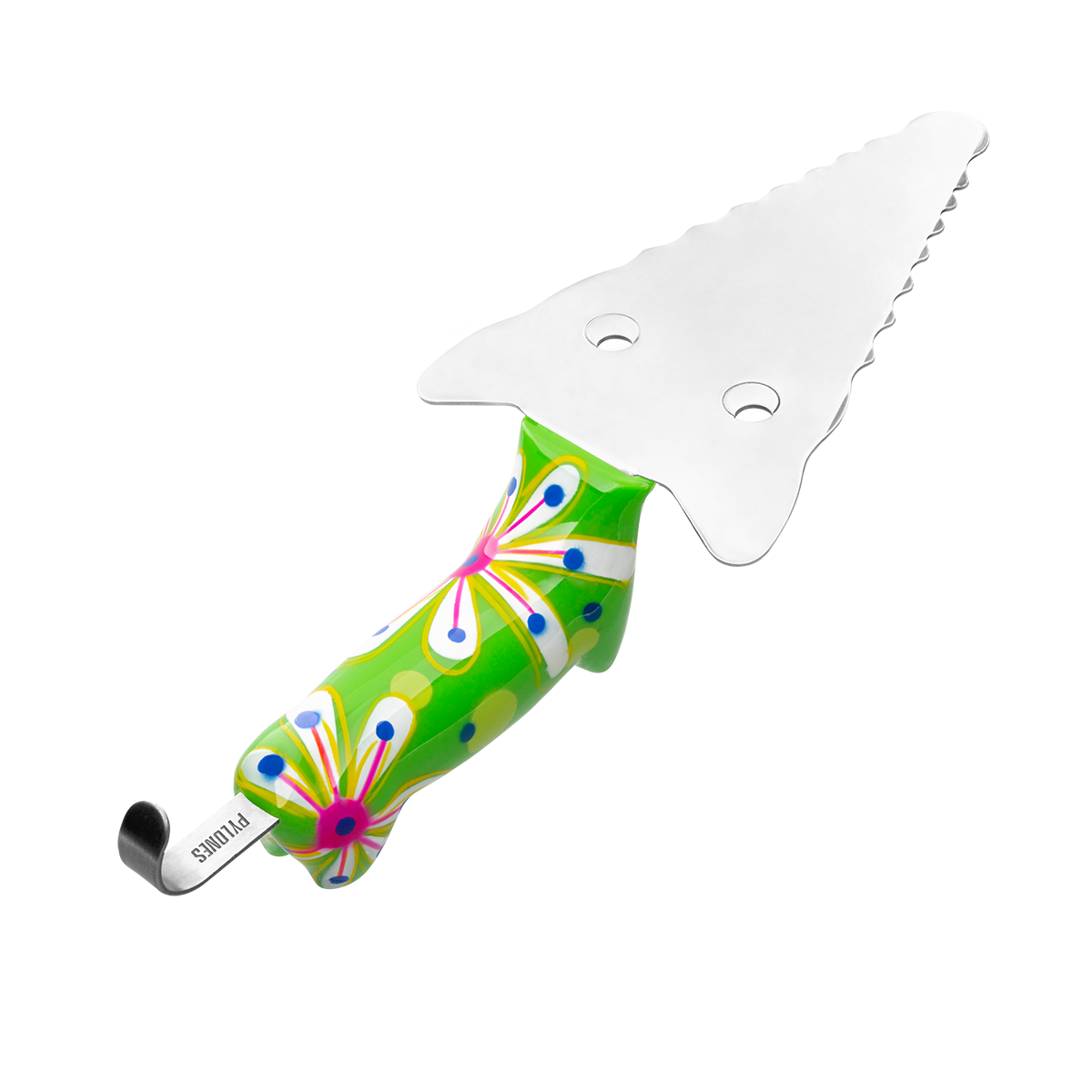Je suis une pelle à tarte mais j'aime également les gâteaux, les quiches, les pizzas et tout ce qui est fait de pâte. Avec mes petites dents je découpe à la perfection vos parts de gâteau.