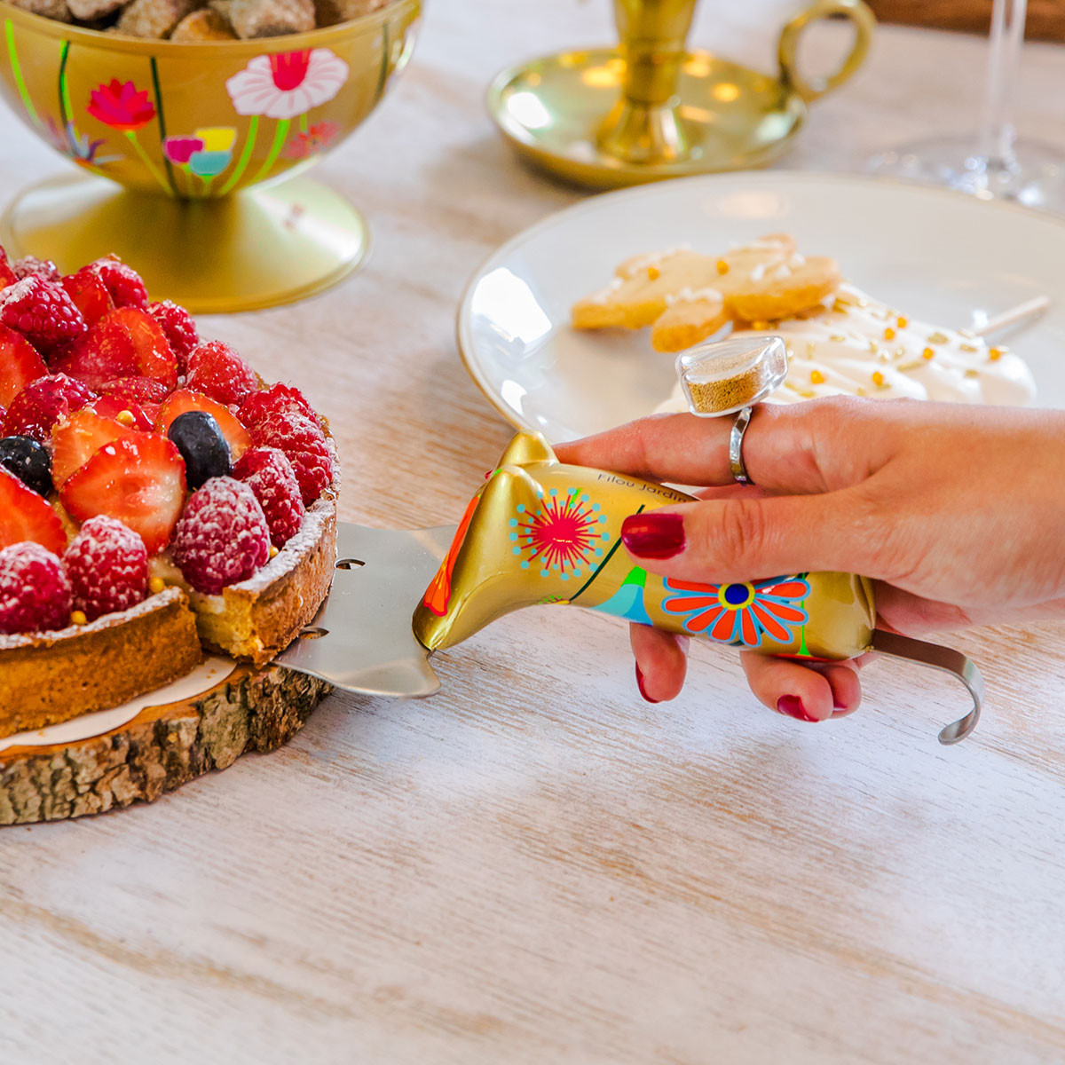 Pelle à gâteau qui a du chien, je tiens sur mes pattes une fois le service fait afin de ne rien salir à mon contact, et ma queue incurvée en forme de petit crochet me permet de m'accrocher dans votre cuisine.