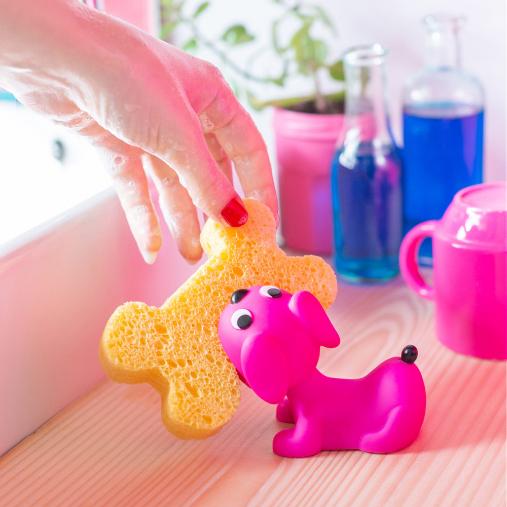 Je suis un chien très domestique qui a peur des grands espaces. Mon terrain de chasse : l’évier. Mon gibier: l’éponge en forme d'os. Je frétille quand mes maîtres s’approchent pour faire la vaisselle et n'importe quelle autre éponge peut me convenir.