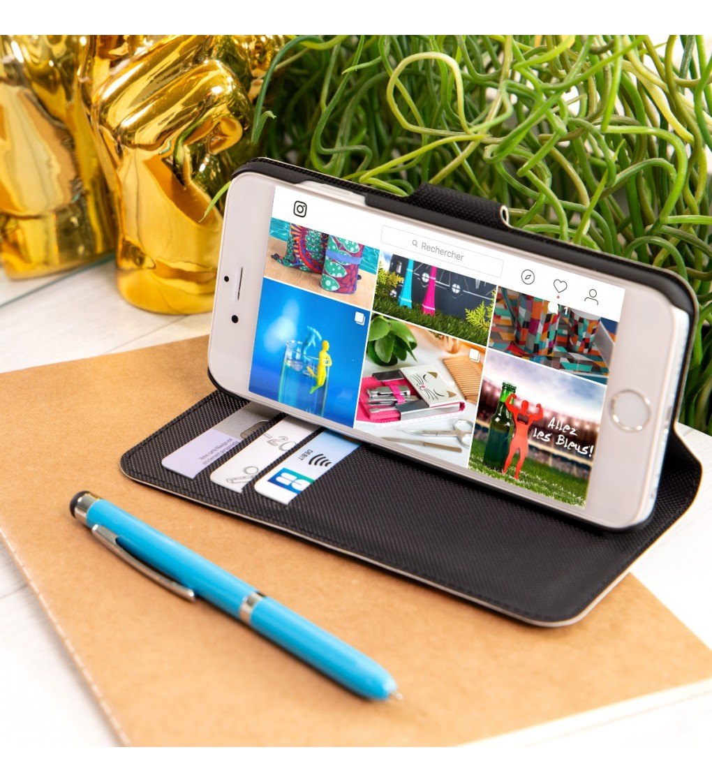 Détails : Deux types de fermeture: élastique ou clapet magnétique. Trois fonctions différentes: protège votre téléphone, permet de ranger vos cartes & sert aussi de support au téléphone.