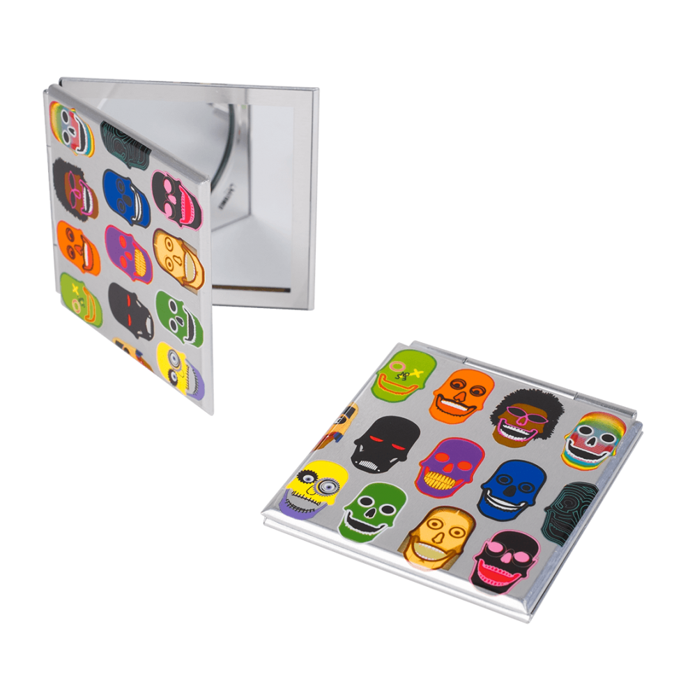 Je suis un double miroir tout mimi (dont un grossissant), l’ami des jolis minois. Fin, délicat, peu encombrant, je suis le contraire d’une armoire à glace.