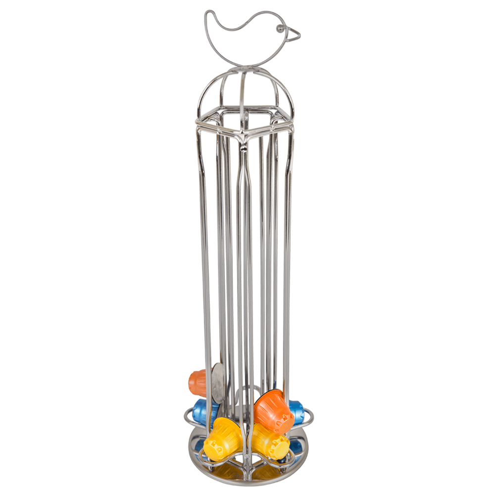 Non vi sentirete più come un uccello in gabbia! Dall'alto della sua torre di cialde Nespresso, questo uccellino sarà felice di offrirti una meritata pausa caffè.